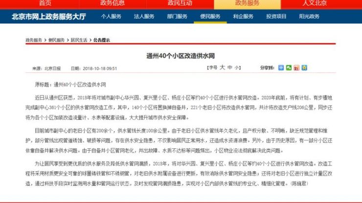 2020年底前,將有計(jì)劃、有步驟地完成副中心361個(gè)小區(qū)的供水管網(wǎng)改造工作,其中,140個(gè)小區(qū)將置換掉自備井,221個(gè)老舊小區(qū)將改造供水管網(wǎng),共計(jì)將改造支戶線206公里,同步還將為各個(gè)小區(qū)加裝改造流量計(jì)、水表等配套設(shè)施,大大提升城市供水安全保障。