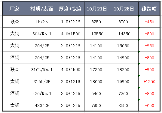 304市場(chǎng)同樣陷入“洶漲”模式,單日漲幅高達(dá)300~500元/噸,甚至出現(xiàn)了單日多次調(diào)漲的現(xiàn)象。短短幾天的時(shí)間,基價(jià)已有超出了15000元/噸。316L冷熱軋產(chǎn)品的漲勢(shì)也十分火爆,周間漲幅也有達(dá)1000元以上。430價(jià)格也同時(shí)逃不出漲價(jià)氣氛,太鋼市場(chǎng)價(jià)格已經(jīng)直指8550!